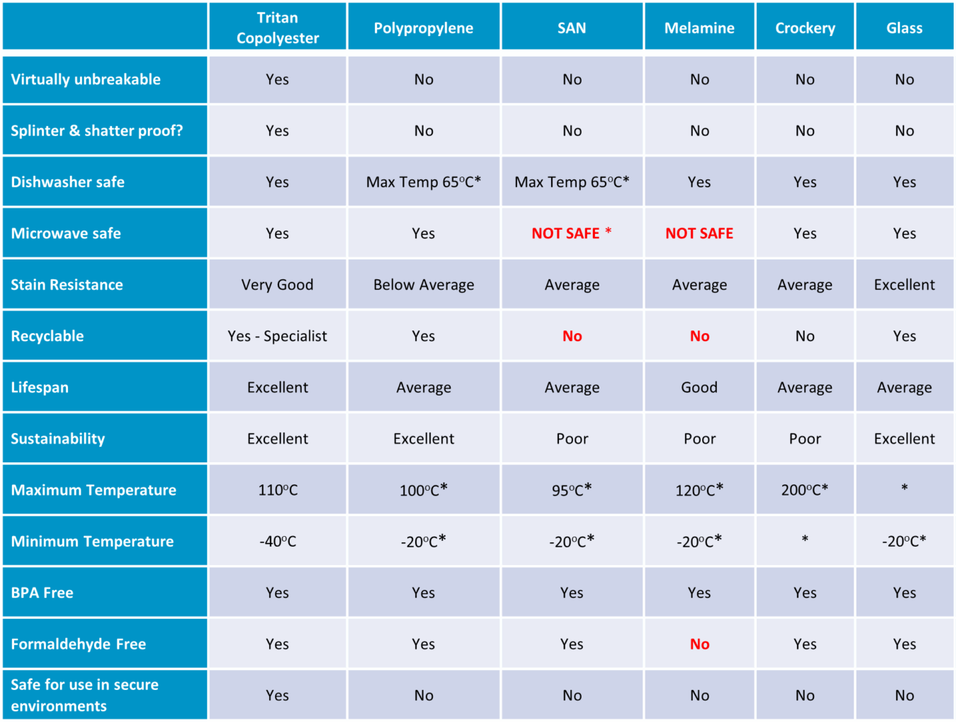 If you are buying replacement tableware, polycarbonate remains the best option while stocks are available. If you would prefer a BPA-free alternative, copolyester is the best choice.