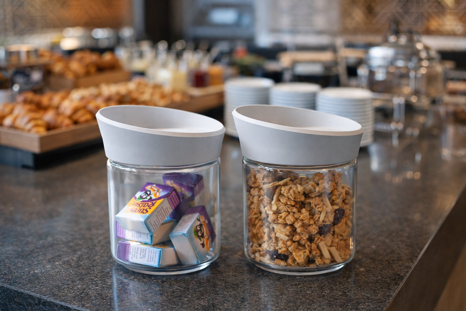 It is perfect for storing various ingredients in the kitchen area such as coffee, tea, herbs and spices and many more. Also a fantastic transparent food container for buffet areas, where you can display food for self service. You can use it for cereals, granola, porridge, fruit, nuts, etc.